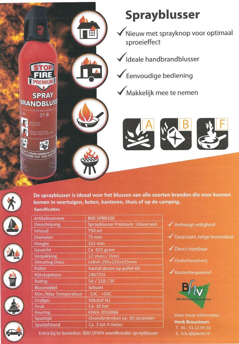 Nieuw met sprayknop voor optimaal sproeieffect - Spuitafstand 3 tot 4 meter Ideale handblusser - Kan hangen in ruimtes tot -10 graden Eenvoudige bediening en makkelijk mee te nemen Geschikt voor vaste stoffen, vloeistoffen, vetbranden en elektra tot 1000 volt. Werkingsduur ongeveer 30 seconden Verhoogt de veiligheid, Duurzaam, lange levensduur, Direct inzetbaar, Onderhoudsvrij en Kostenbesparend. Prijs sprayblusser € 19.50 incl. btw. Ophangbeugel los verkrijgbaar kosten € 5.00